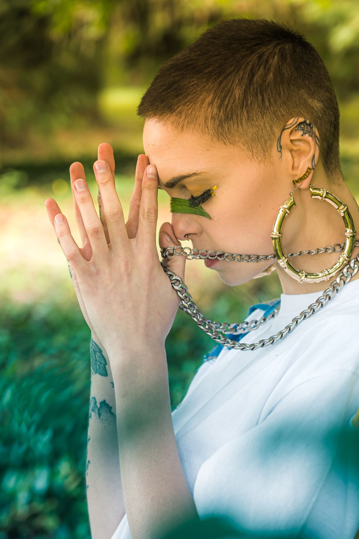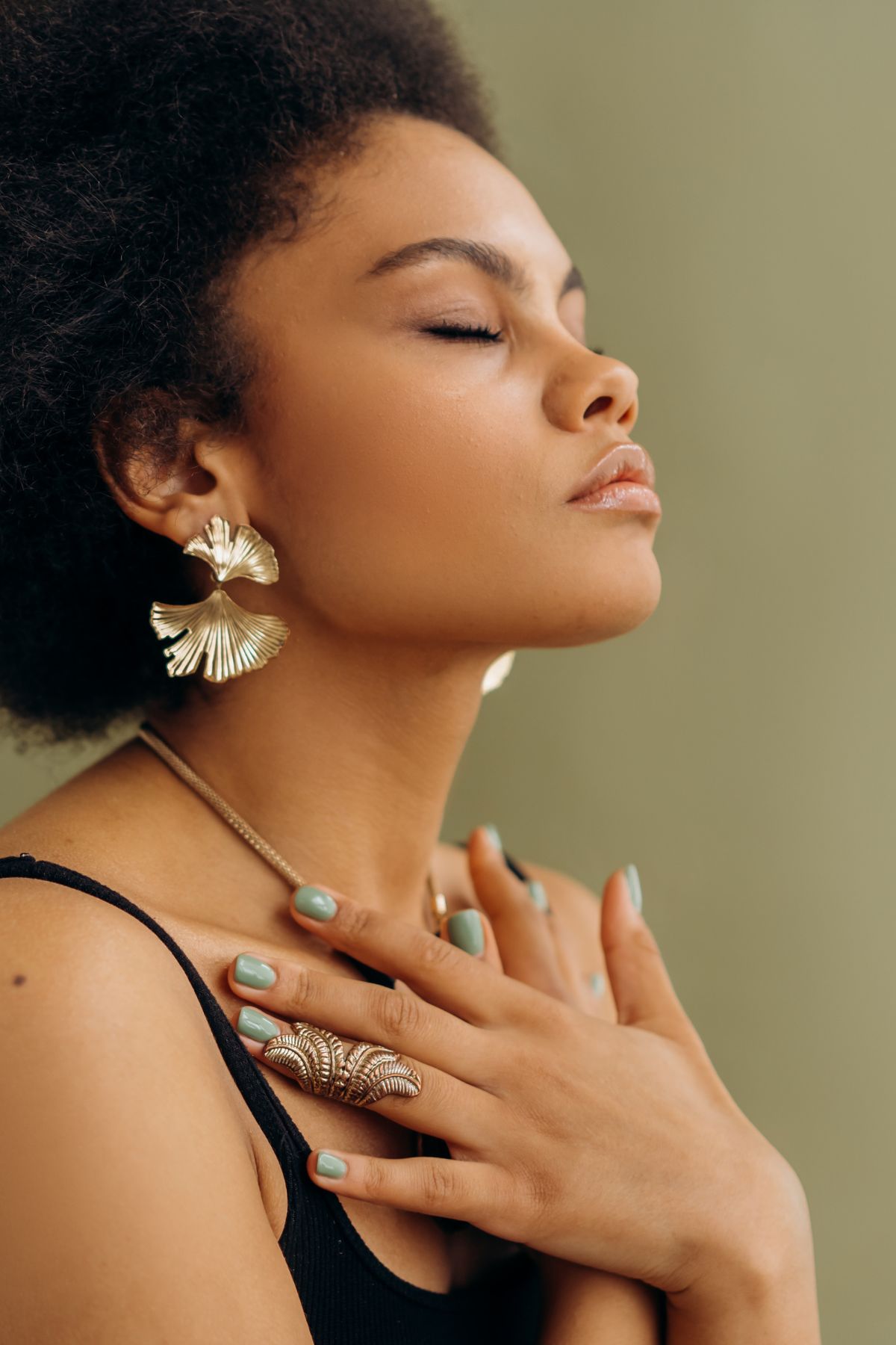 A woman with her eyes closed and hands on over her heart center.